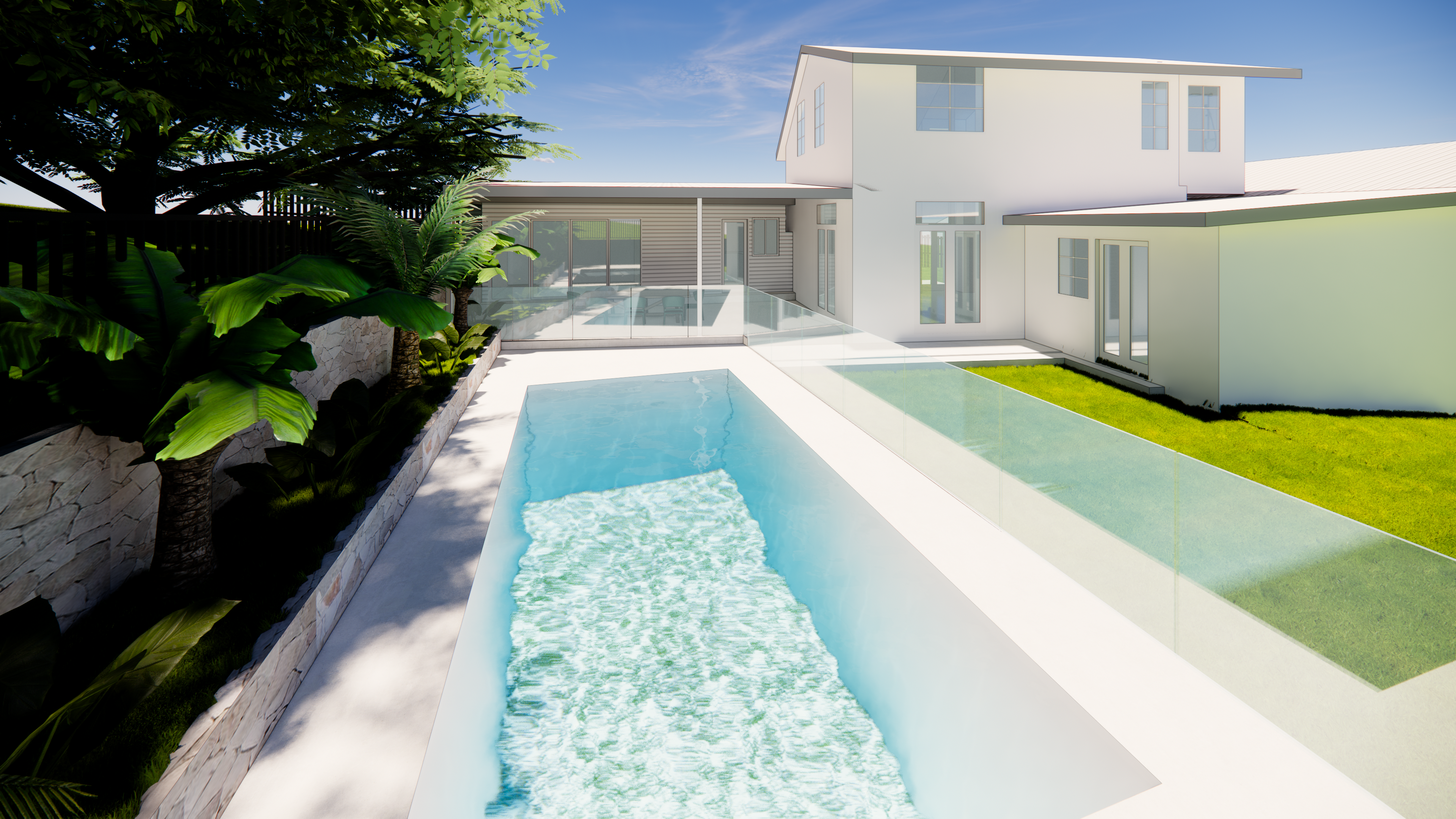 This project developed a private one-bedroom granny flat with a workspace and pool, re-configuring the main house for enhanced connectivity between indoor and outdoor living areas.